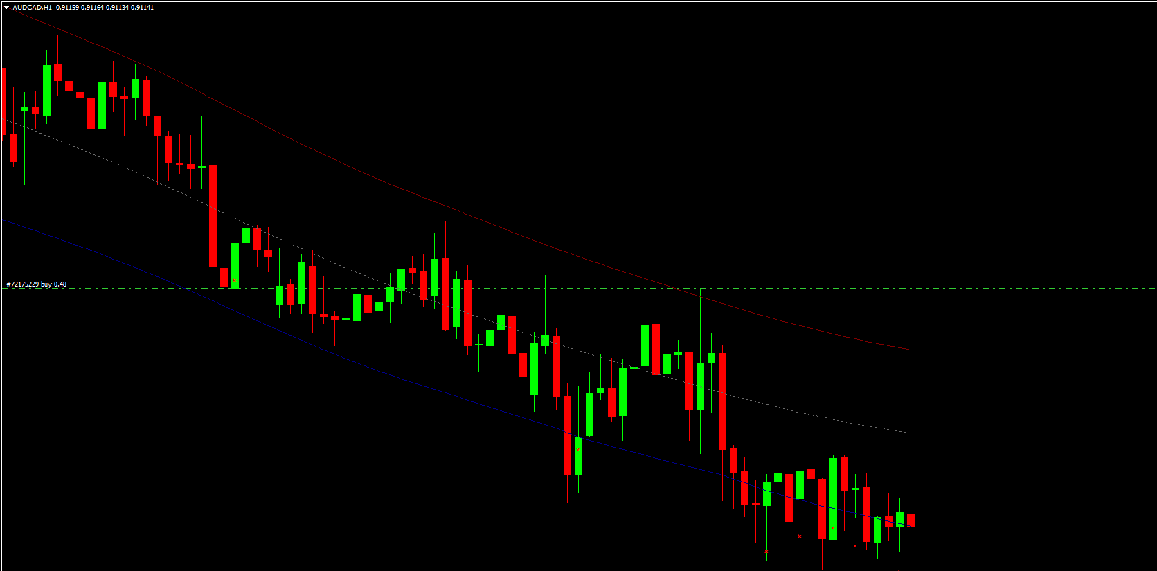 Oversold Condition: When the price drops below the lower channel, a red dot appears, signaling a potential buy trade.