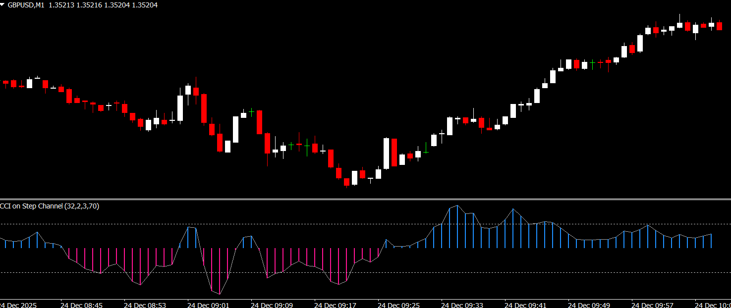The indicator plots a step channel on your MT4 chart and overlays the CCI, a momentum indicator that measures Trend Strength. Traders can use this combination to identify key trading signals: