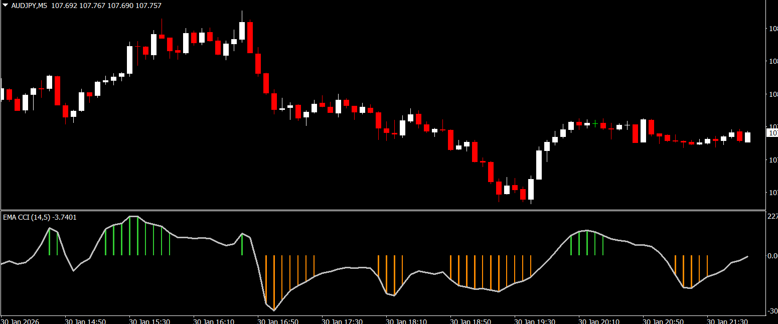 The indicator calculates the pre-filtered CCI values and plots them as a colored histogram on the MT4 chart.