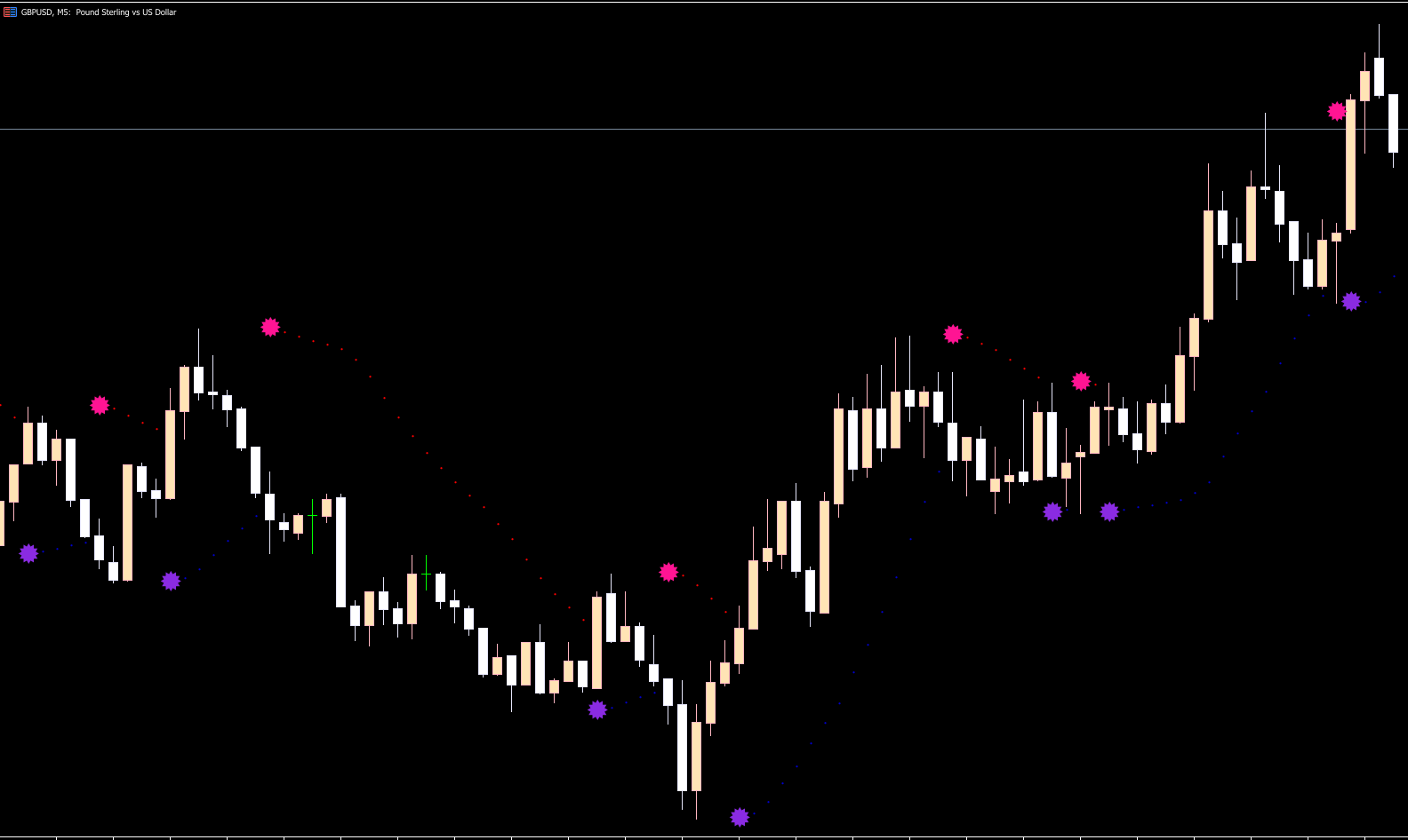 The Color Parabolic Alert Indicator MT5 generates signals based on market trend direction and potential reversals: