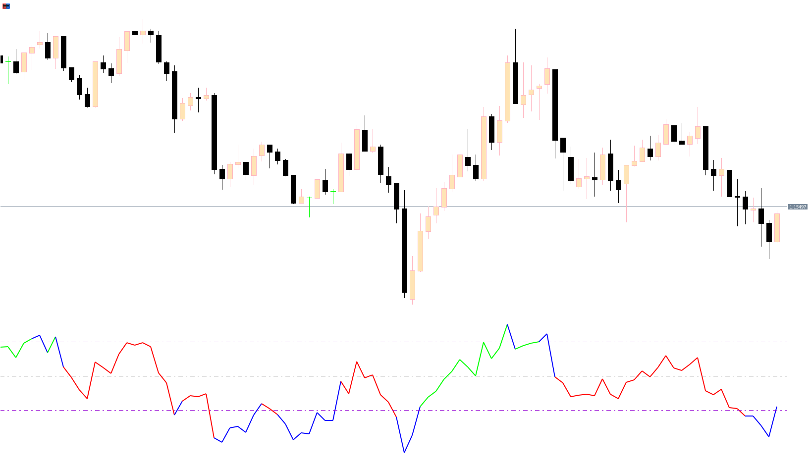 Color-coded oscillator: The indicator changes color based on market conditions – red indicates oversold, green signals overbought, and blue represents neutral zones.