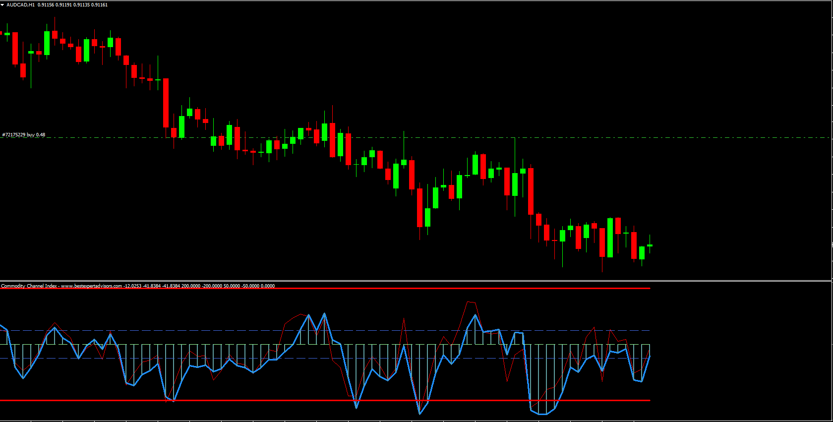 The Commodity Channel Index is calculated by comparing the current price of a currency pair to its average price over a specific period. This difference is then divided by the mean deviation of price over the same period. The result is plotted as an oscillator that moves above and below a zero line.