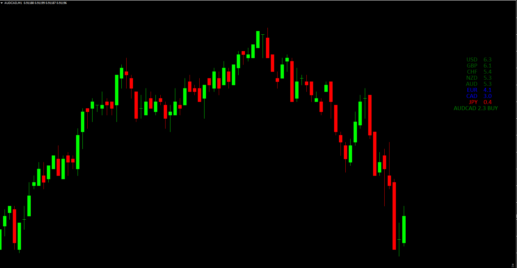 Currency strength values are displayed clearly, allowing traders to quickly identify the strongest and weakest currencies.