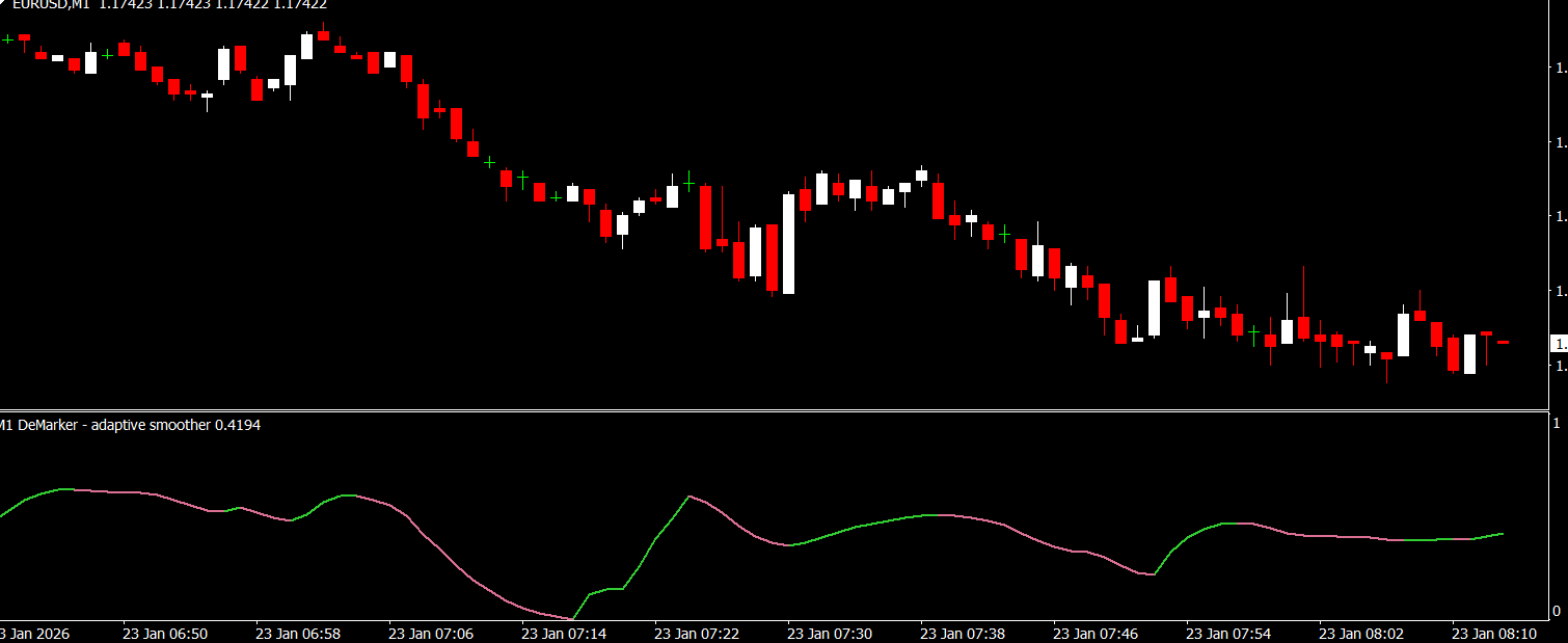 Unlike a standard DeMarker, this version adapts to market volatility. During volatile conditions, smoothing is adjusted to reduce noise, while during steady trends, signals remain responsive to market changes.