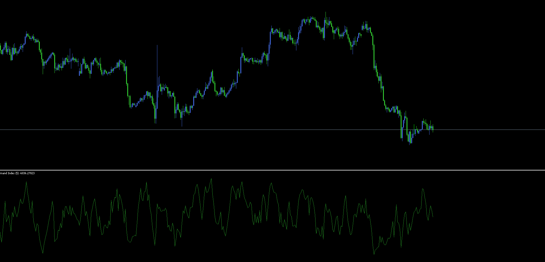 On an MT5 chart, the Demand Index plots a single signal line below the main price chart.
