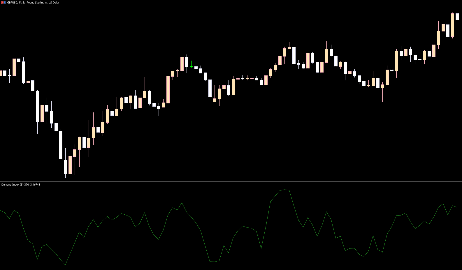 A strong demand index value suggests that price movement is supported by strong buying interest, while lower values may indicate selling pressure or trend exhaustion.