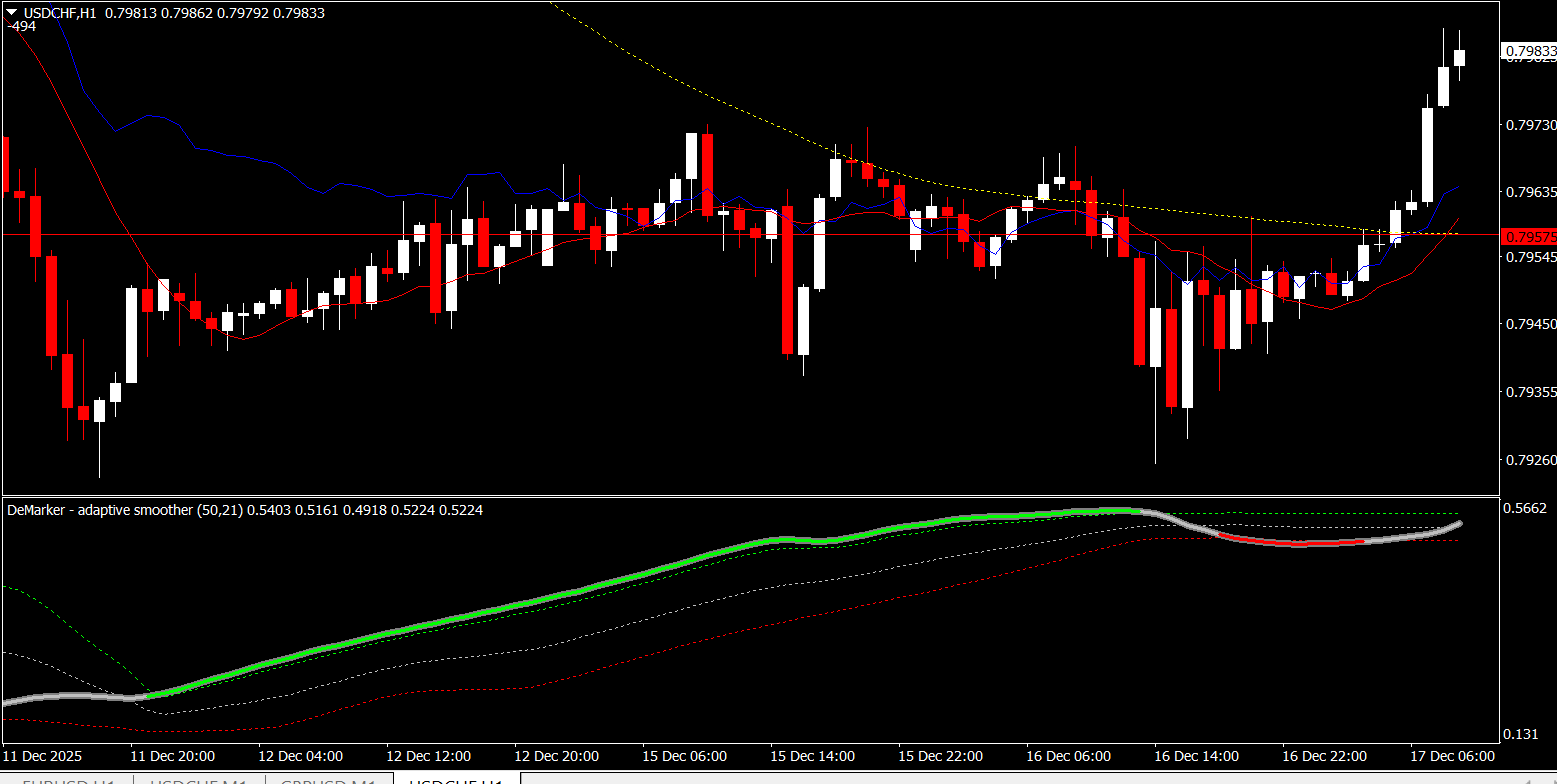 The main line is derived from the traditional DeMarker oscillator, which compares the current price with the previous period’s high and low. It helps determine if the market is in an overbought or oversold condition based on price action.
