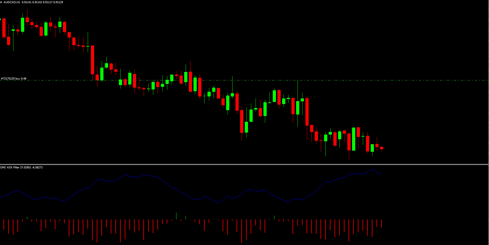 The indicator plots DMI histogram bars and an ADX line on your MT4 chart: