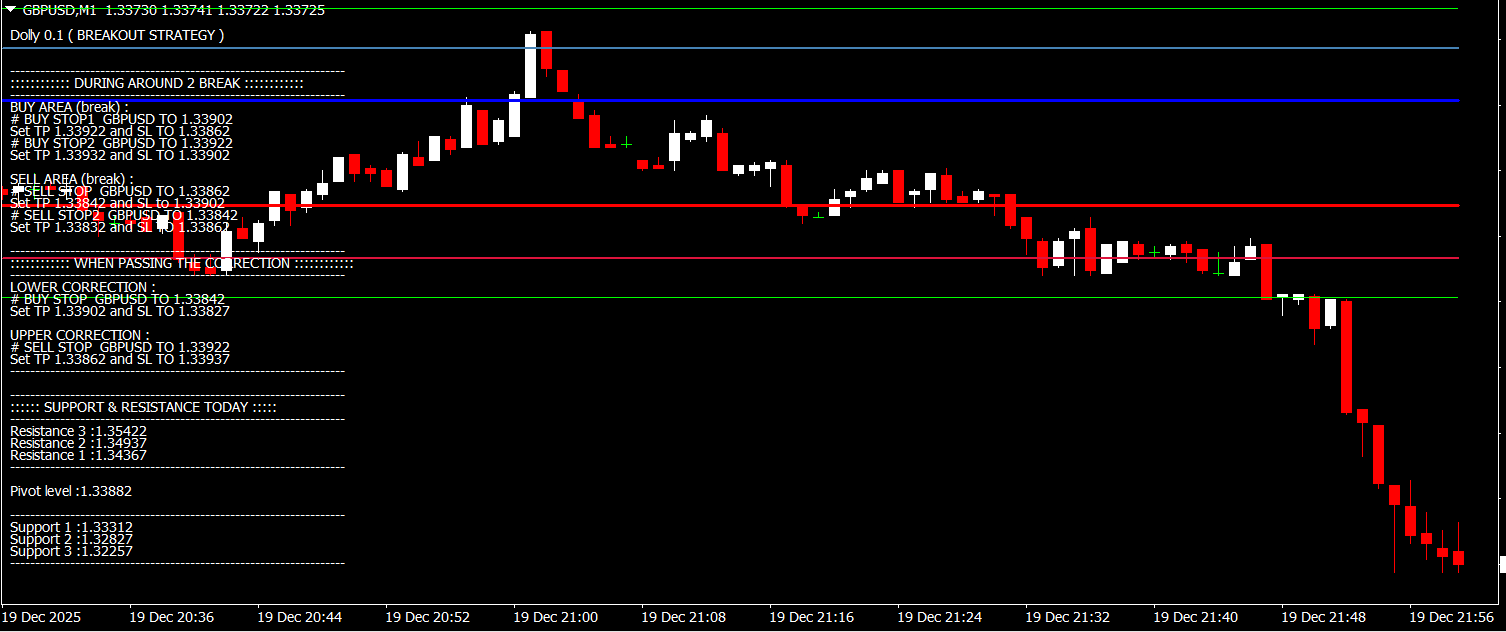 The Dolly Breakout Forex Indicator plots two key lines directly on the price chart: