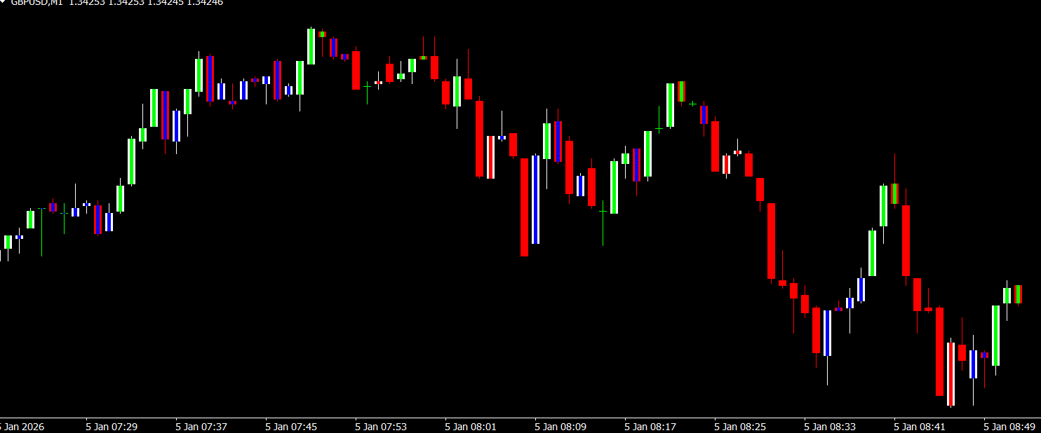 The color-coded candles provide a clear representation of trend direction, reducing hesitation and improving confidence in trade execution.