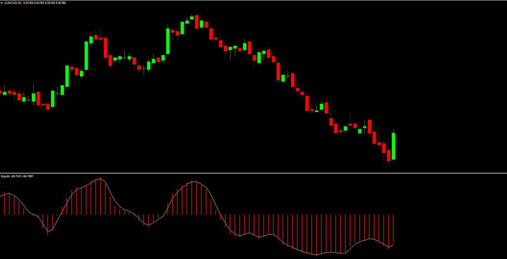 The Ergodic Indicator is a trend oscillator similar to MACD. It combines a smooth moving average with bar charts oscillating around a zero line. The indicator appears in a separate window below the price chart, making it easy to analyze market momentum.