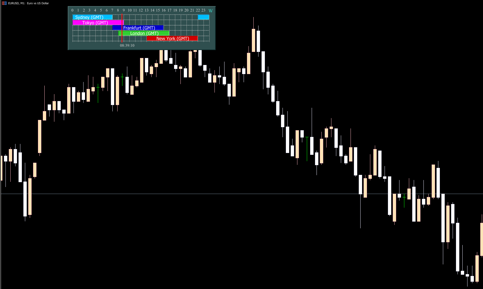 The indicator uses GMT time as a fixed reference and overlays trading session blocks on the chart. These blocks visually represent when each global session is active.