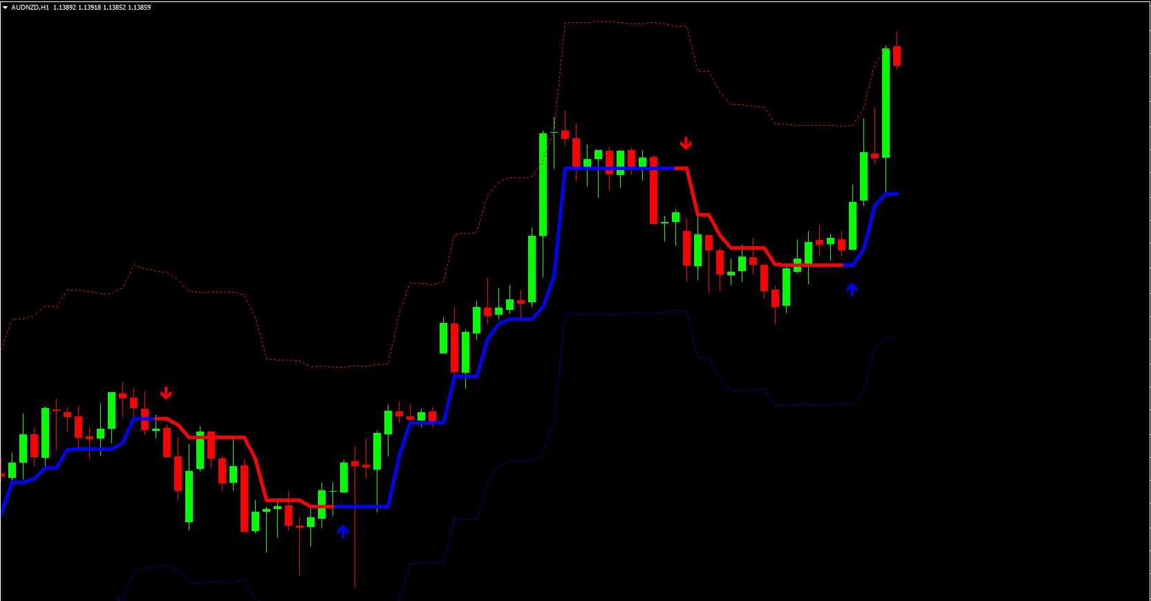 Red arrow: A sell signal triggers when the price shows weakness near the upper boundary.