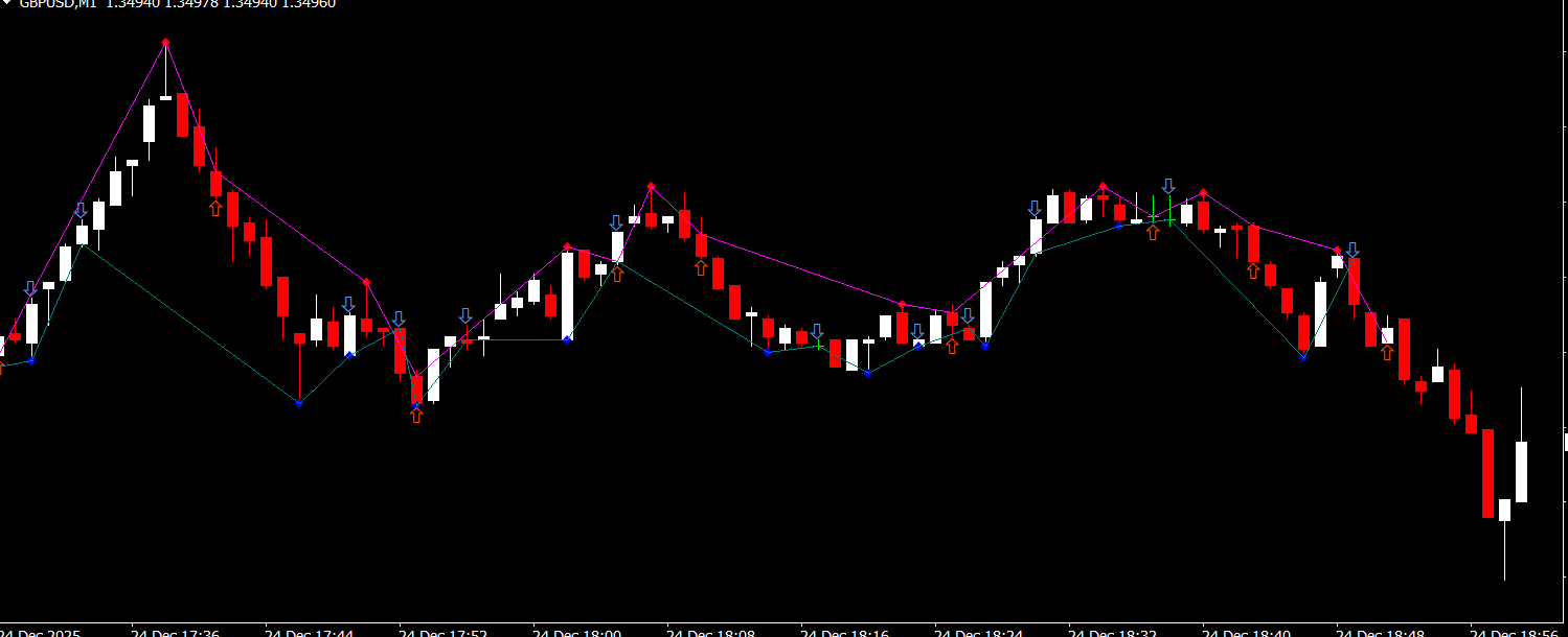 Once attached to a MetaTrader 4 chart, the indicator automatically tracks price movements and provides real-time signals. Key functionalities include: