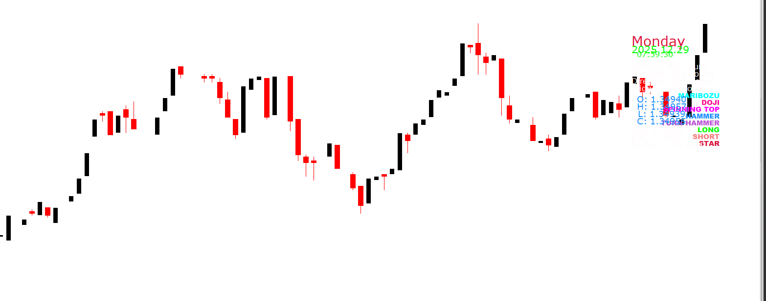 After adding the FX Candlestick Patterns Indicator to any MT4 chart, it begins analyzing candlestick formations in real time. When a recognized pattern forms, the indicator displays: