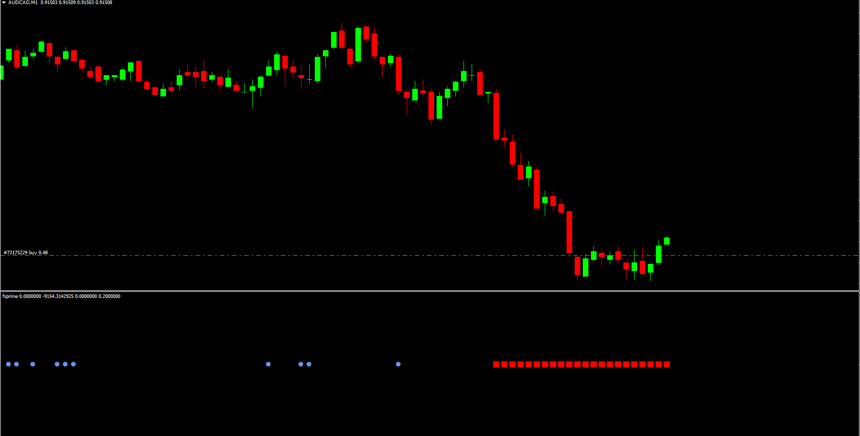 The FX Prime indicator displays its signals through color-coded bars in a dedicated subwindow: