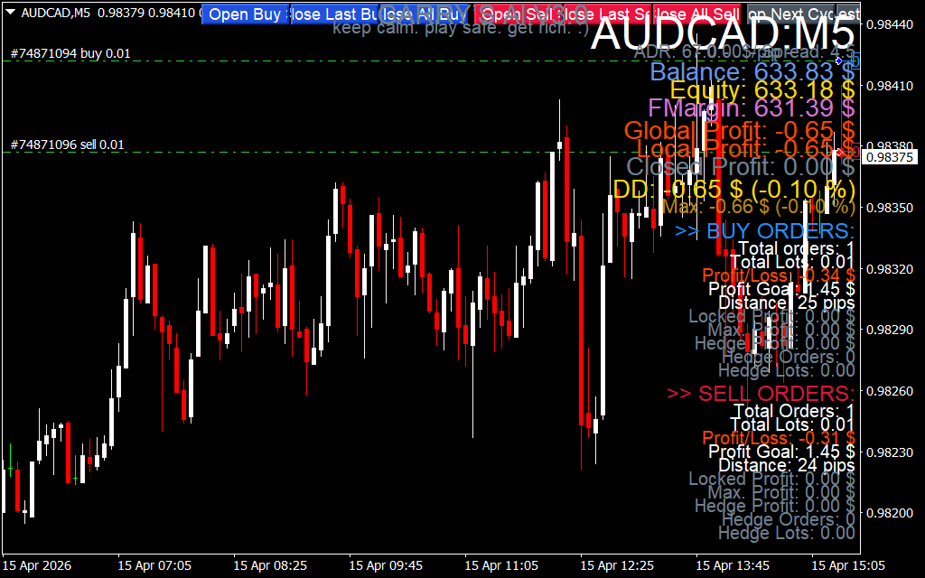 This level of transparency is vital for risk management. By seeing your "Local" and "Global" profits updated live, you can make informed decisions about your portfolio's exposure. The slogan "keep calm. play safe. get rich." isn't just a catchy phrase—it's the core logic behind the EA's risk-mitigation protocols.