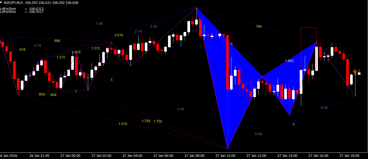 The indicator identifies Gartley patterns on the chart, which are specific combinations of price swings that indicate a potential reversal in the market. Gartley patterns are a type of harmonic pattern, relying on Fibonacci retracements to determine the correct structure.