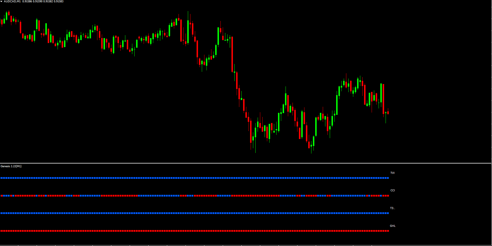 The Genesis Matrix 2.22 Indicator uses a matrix-based system that combines several technical components into a single visual interface. These components typically include: