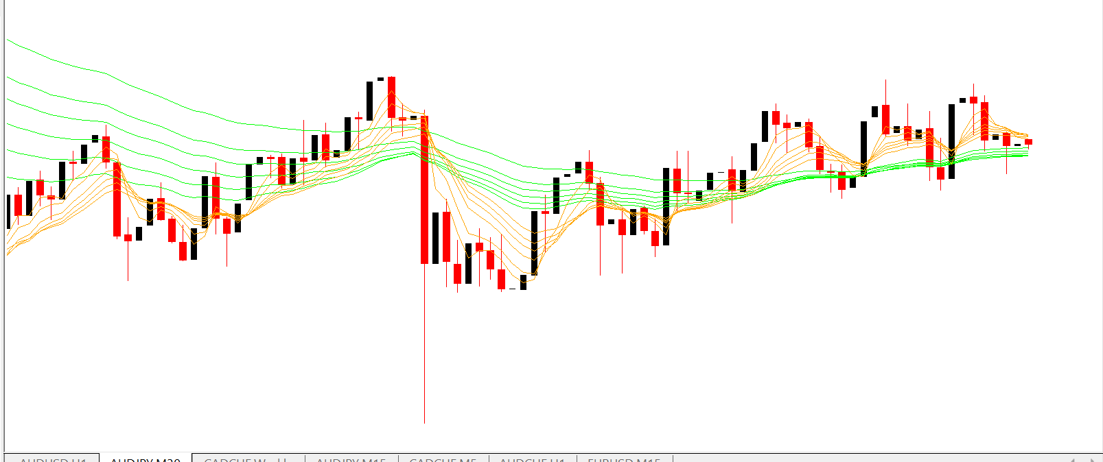 The indicator visually displays EMA groups on the chart, making trend analysis simple and intuitive.