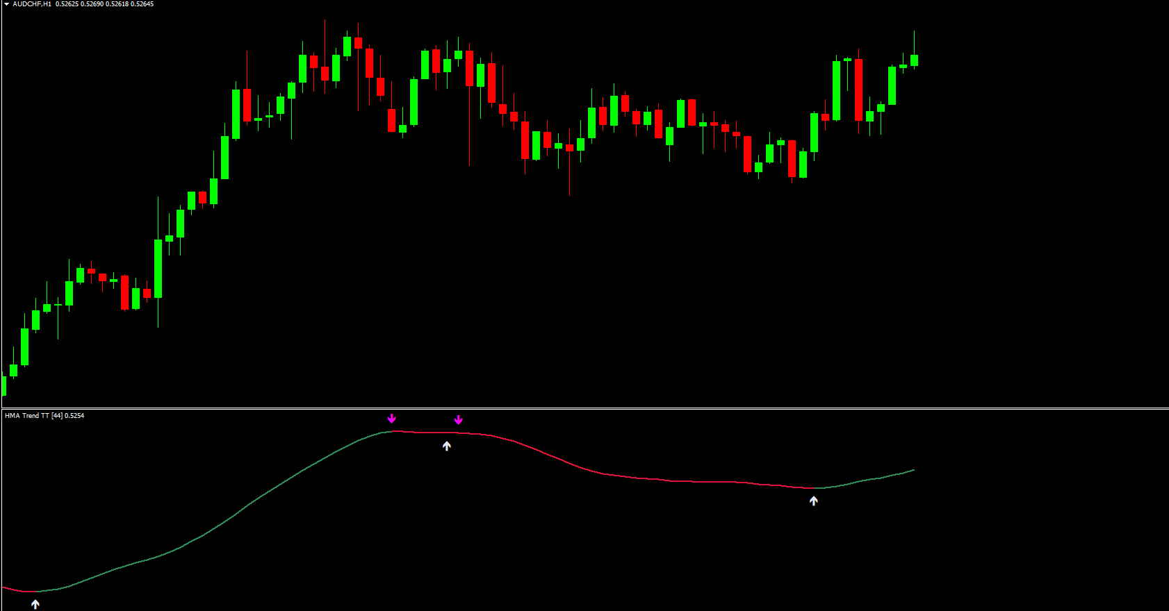 The image below illustrates how the HMA Mega Trend Indicator performs on the EURUSD H4 timeframe. The indicator clearly identifies the ongoing uptrend. In this scenario, traders should focus on buy signals (white arrows) that align with the bullish trend, while ignoring sell signals (magenta arrows) that move against it.