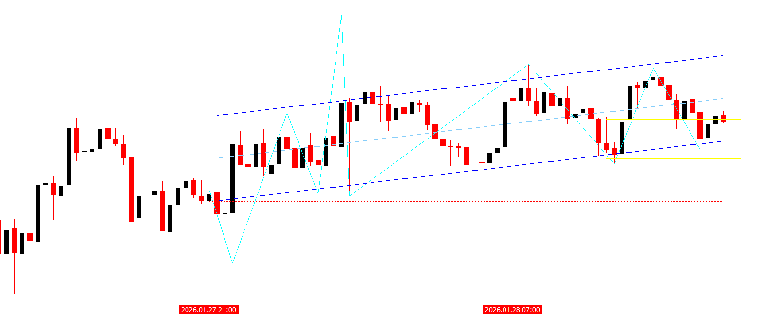 A line is plotted on the chart following the price trend.