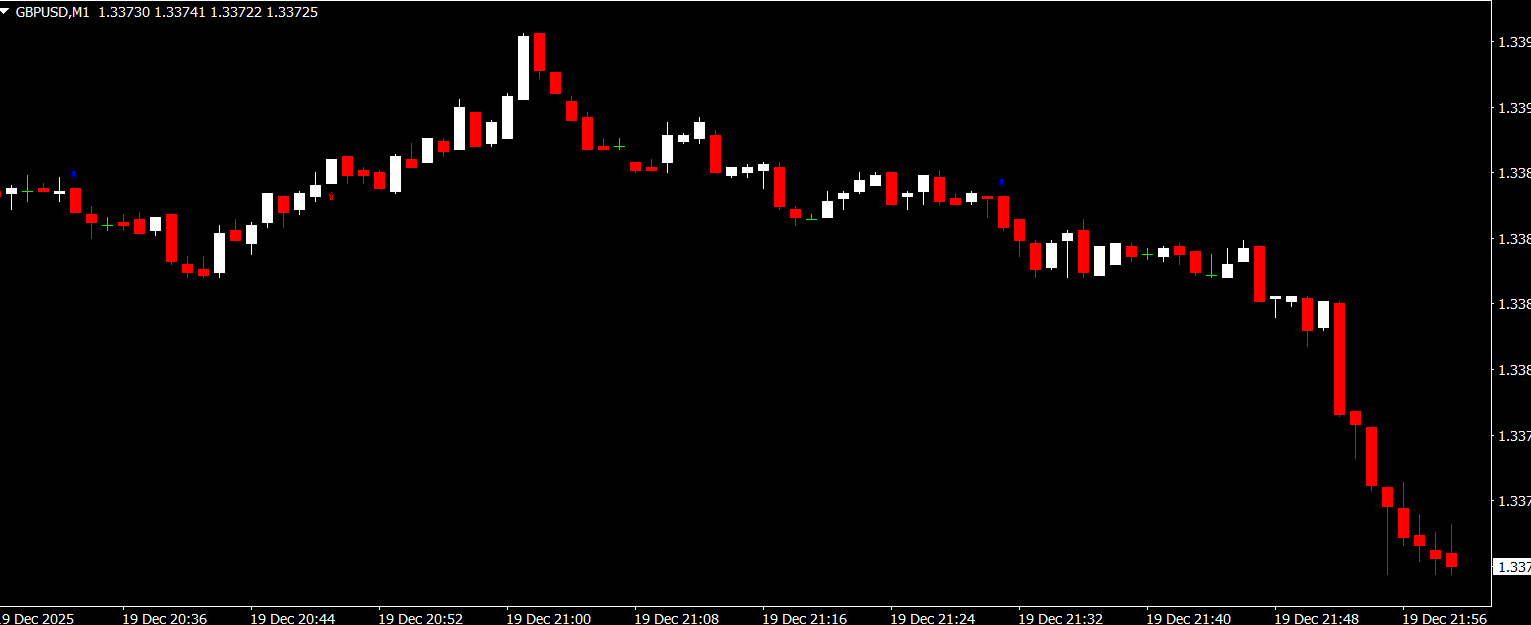 A sell arrow appears when downward momentum is detected, signaling a potential short position.