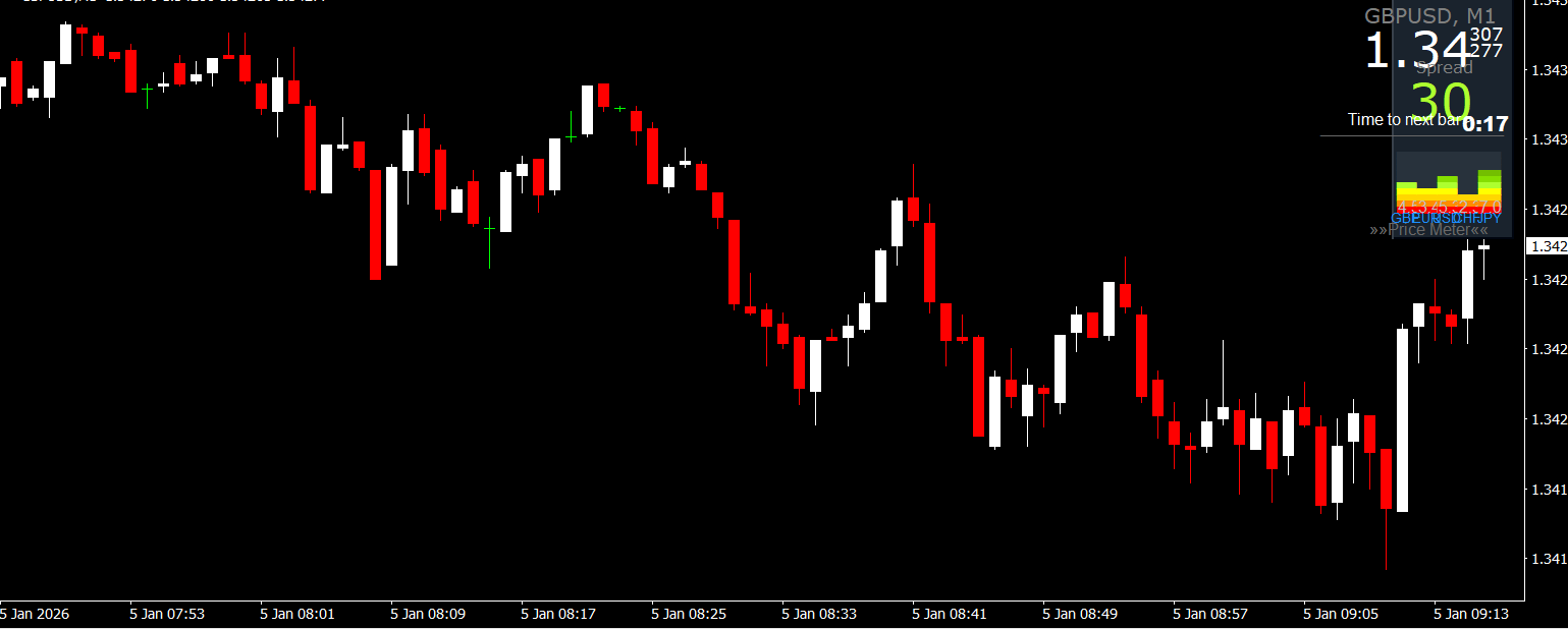 The indicator displays a real-time price panel on the chart, showing the current price of a selected currency pair. It uses visual cues to help traders analyze trend direction and momentum.
