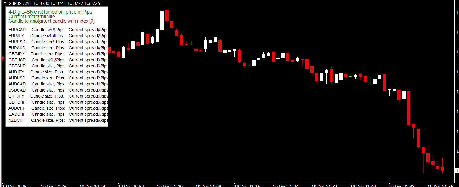 The InfoPanel Candle Sizes & Spreads Indicator is easy to install. Simply add it to the MT4 platform, and it will display real-time candle size and spread data. No complex setup is required, making it accessible to traders of all experience levels.