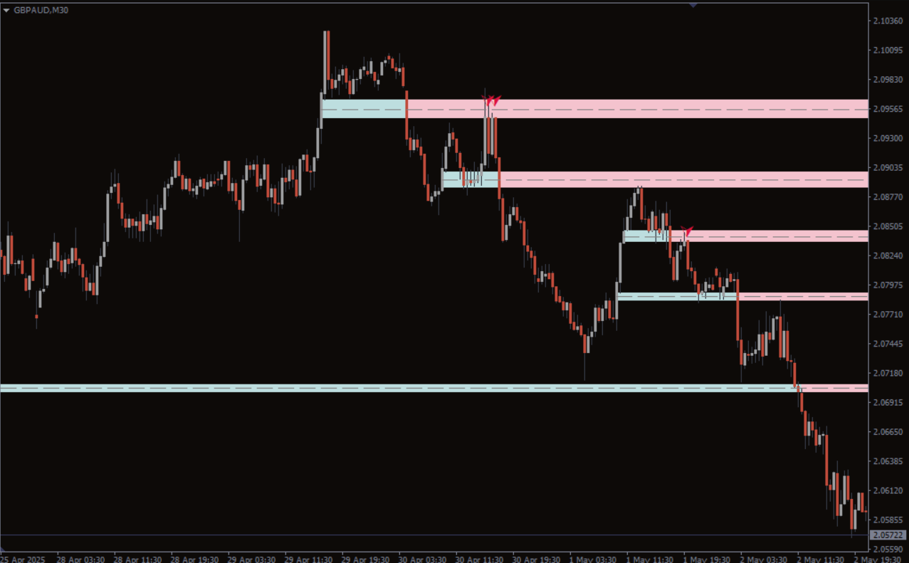 The IFVG indicator scans recent price action, candle structure, and volatility to detect inverted fair value gaps. Once identified, the indicator highlights these zones on the chart using colored rectangles, updated dynamically as price evolves.