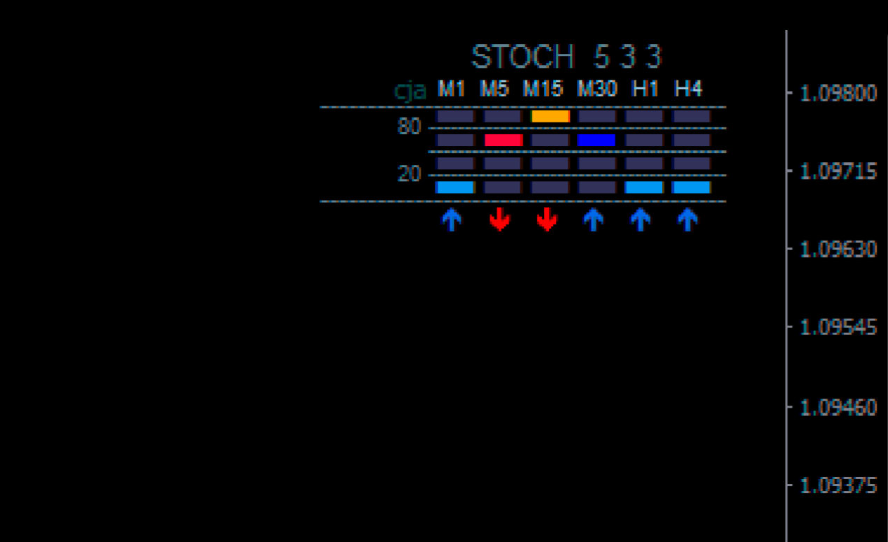 When the stochastic reaches extreme levels, the indicator highlights these areas with colored bars, allowing traders to easily spot potential reversals or continuation points. This visual approach simplifies market analysis and reduces the need for multiple indicators.
