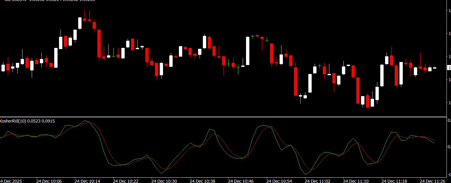 The KRVI Indicator calculates RSI and ADX values for the current price and then plots a line representing their average. This line helps traders quickly see whether a currency pair is overbought or oversold: