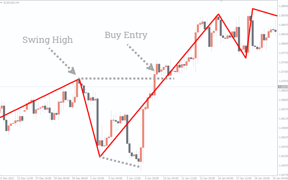 Once the price breaks above this swing high and retests it successfully, a bullish confirmation candle appears — a high-probability buy signal.