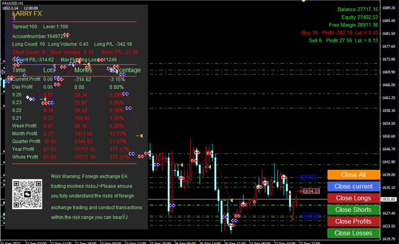 One of the first things that impressed me was its transparent trading panel. Unlike many EAs that run silently in the background, Larry FX EA displays real-time profits, open trades, and essential data directly on the chart. With built-in buttons like Close All, Close Longs, and Close Profits, traders have instant manual control when needed — a rare and valuable feature for MT4 robots.