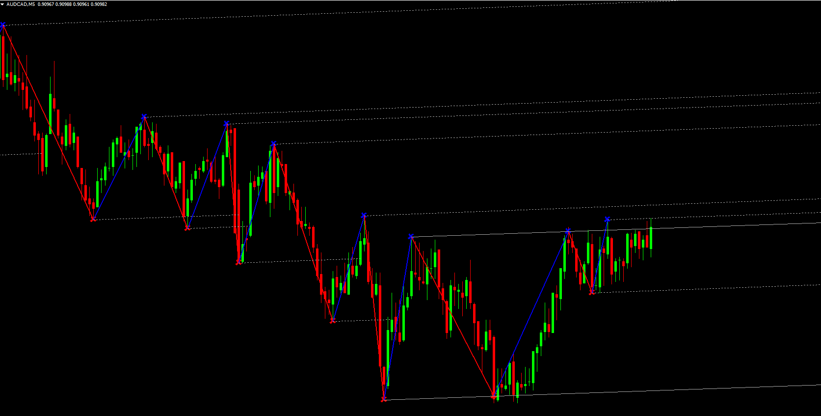 Plots trend lines (blue for uptrend, red for downtrend)