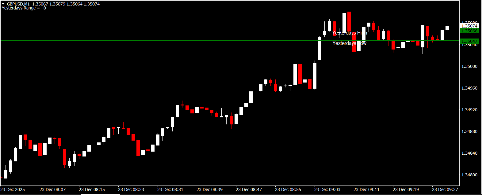 Green Line: Indicates a bullish trend when the price is above yesterday’s range.