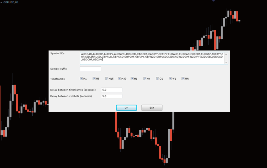For example, a trader can load GBPUSD, EURUSD, and USDJPY history simultaneously, filter for H1 and H4, and get a complete historical picture for technical analysis.