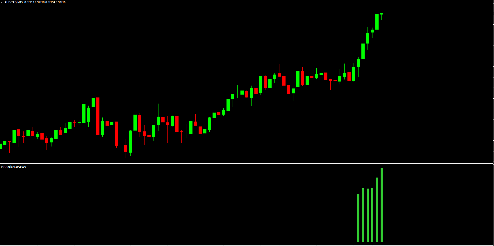 The core functionality of the MA Angle 2 Indicator revolves around the angle of the moving average line on the price chart: