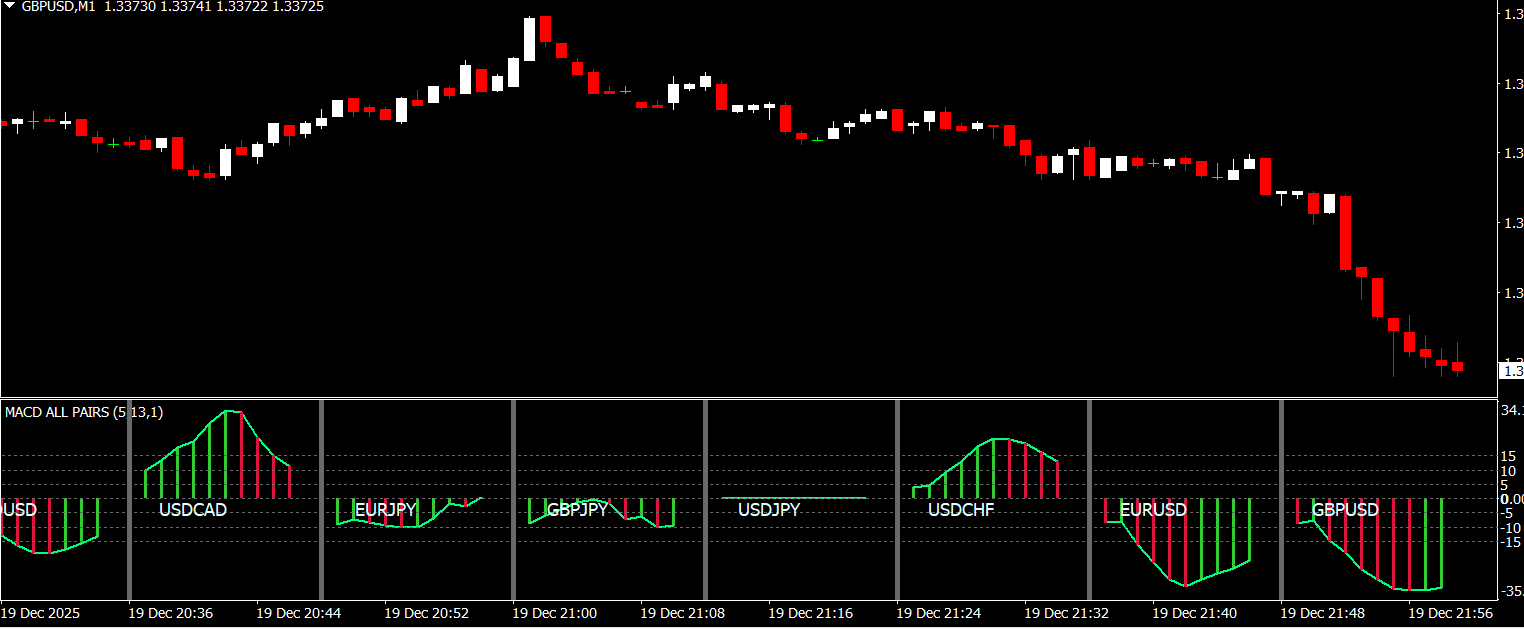 Once installed on MT4, the MACD Different Pairs Indicator continuously monitors selected currency pairs.