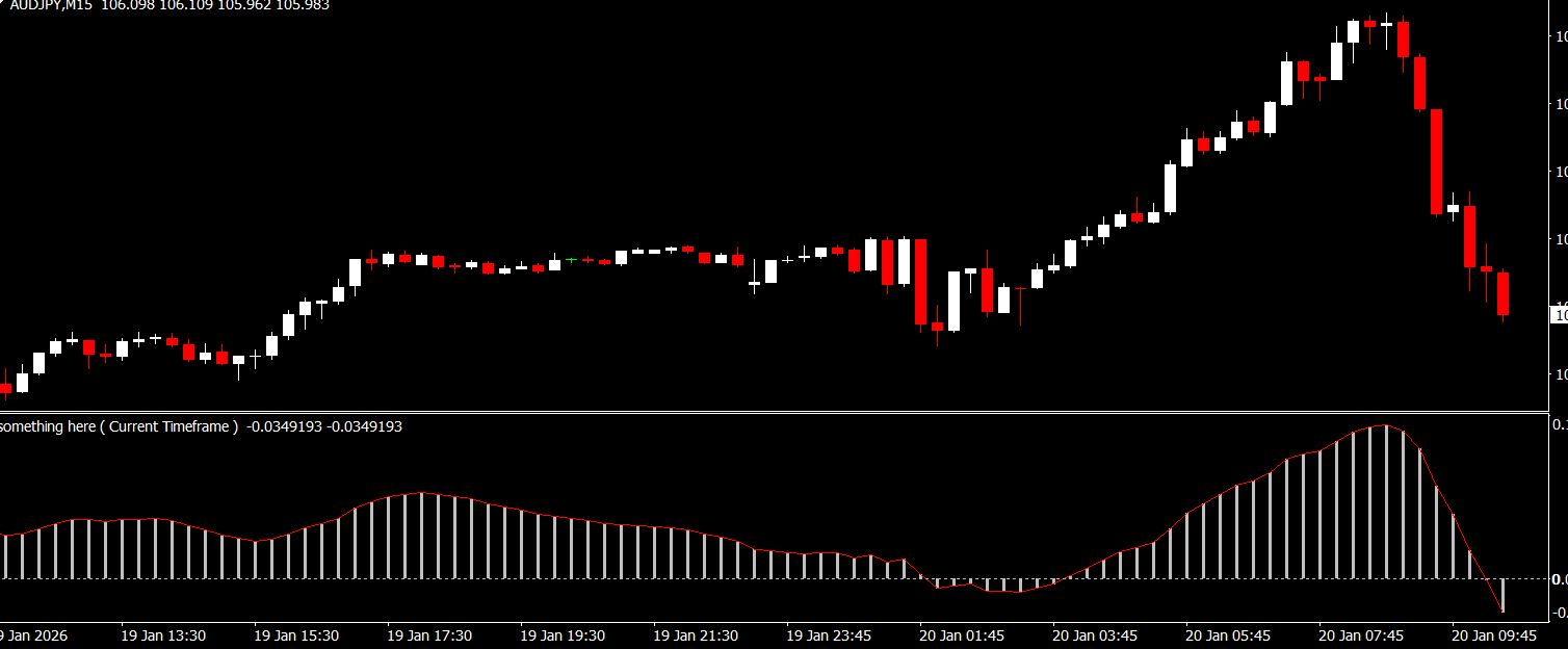 The indicator is displayed in a separate chart window and revolves around the zero line, which plays a crucial role in signal generation.