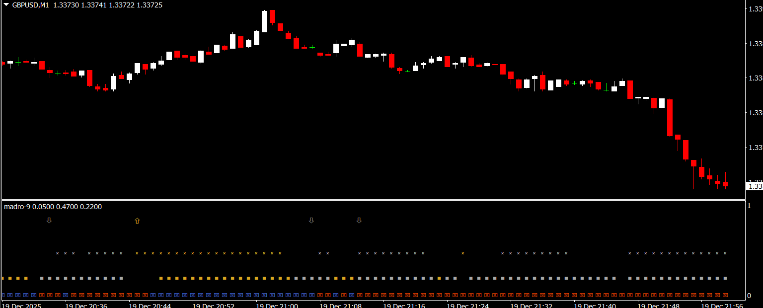 The Madro Golden Filter operates by analyzing the price movement of a currency pair. When a trend begins to form or reverse, the indicator plots an arrow on the chart: