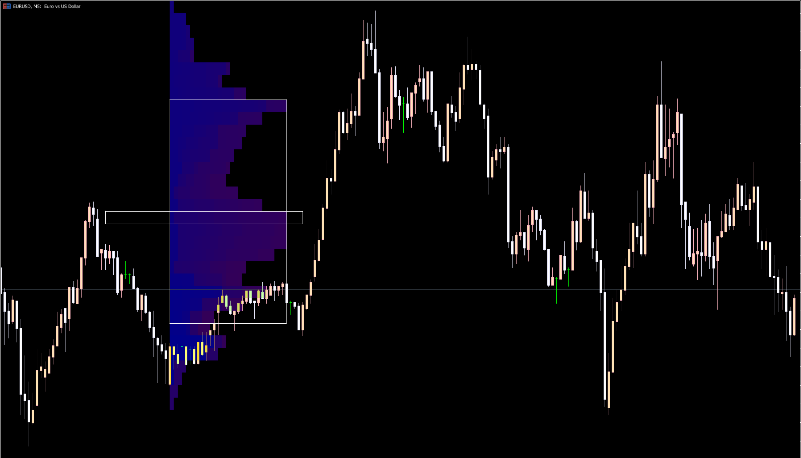The indicator plots a profile histogram on the chart that shows the volume traded at each price level over a selected period.