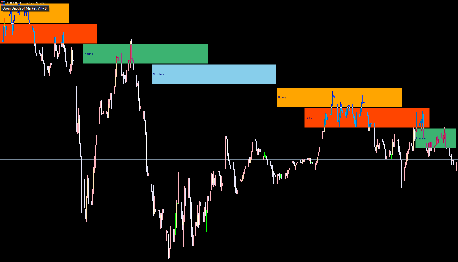 Colored zones or time markers show when each session is active. This helps traders quickly identify: