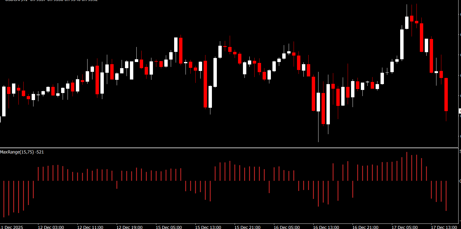 The Max Range Bars Indicator analyzes each candle and measures its maximum pip range. Based on this range, it plots a bar that visually represents how volatile that candle was.