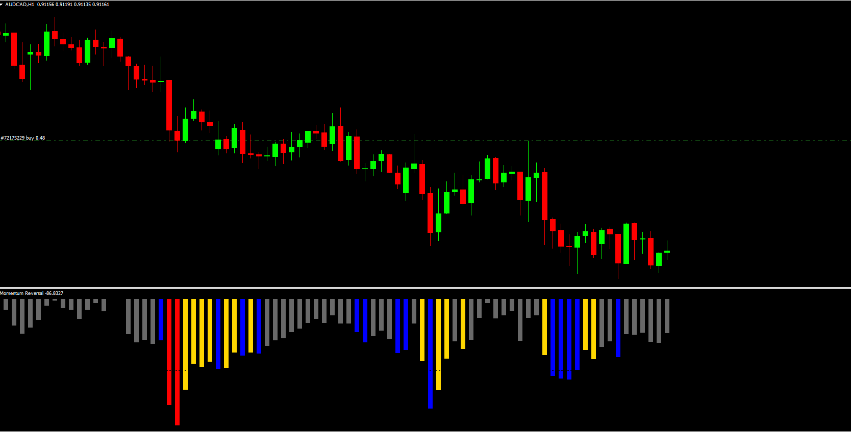The Momentum Reversal Detector Indicator uses a proprietary momentum algorithm to evaluate the strength and direction of price movement. It continuously analyzes Price Action and: