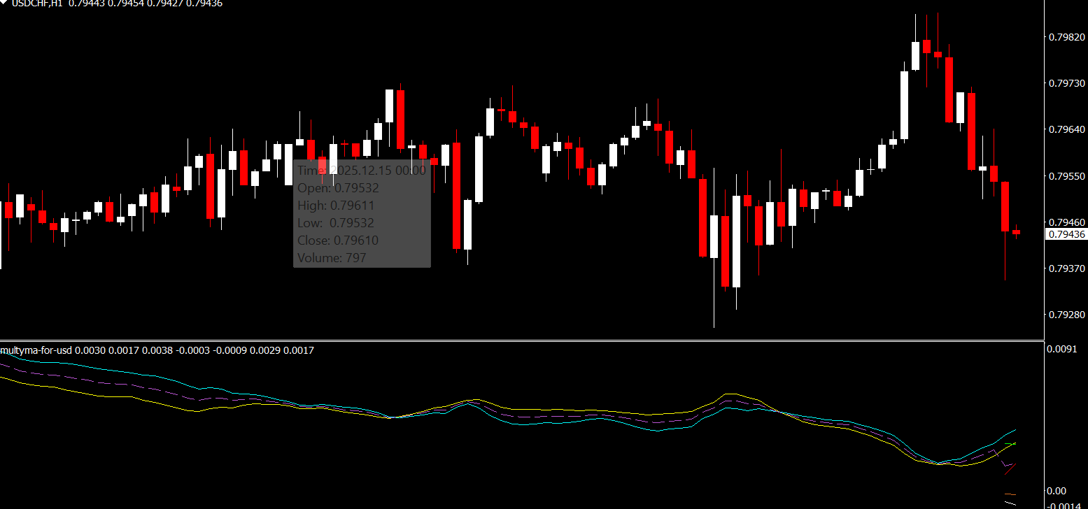 Multyma USD displays multiple moving averages specifically optimized for USD pairs. It helps identify trend direction, support/resistance levels, and potential trading opportunities using a combination of different moving average periods.