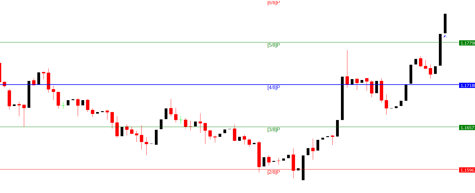 The Murrey Levels Indicator plots 8 lines on the MT4 chart, each representing a distinct wave cycle in the Murrey Math system. These lines are color-coded to help traders quickly identify potential support and resistance areas.