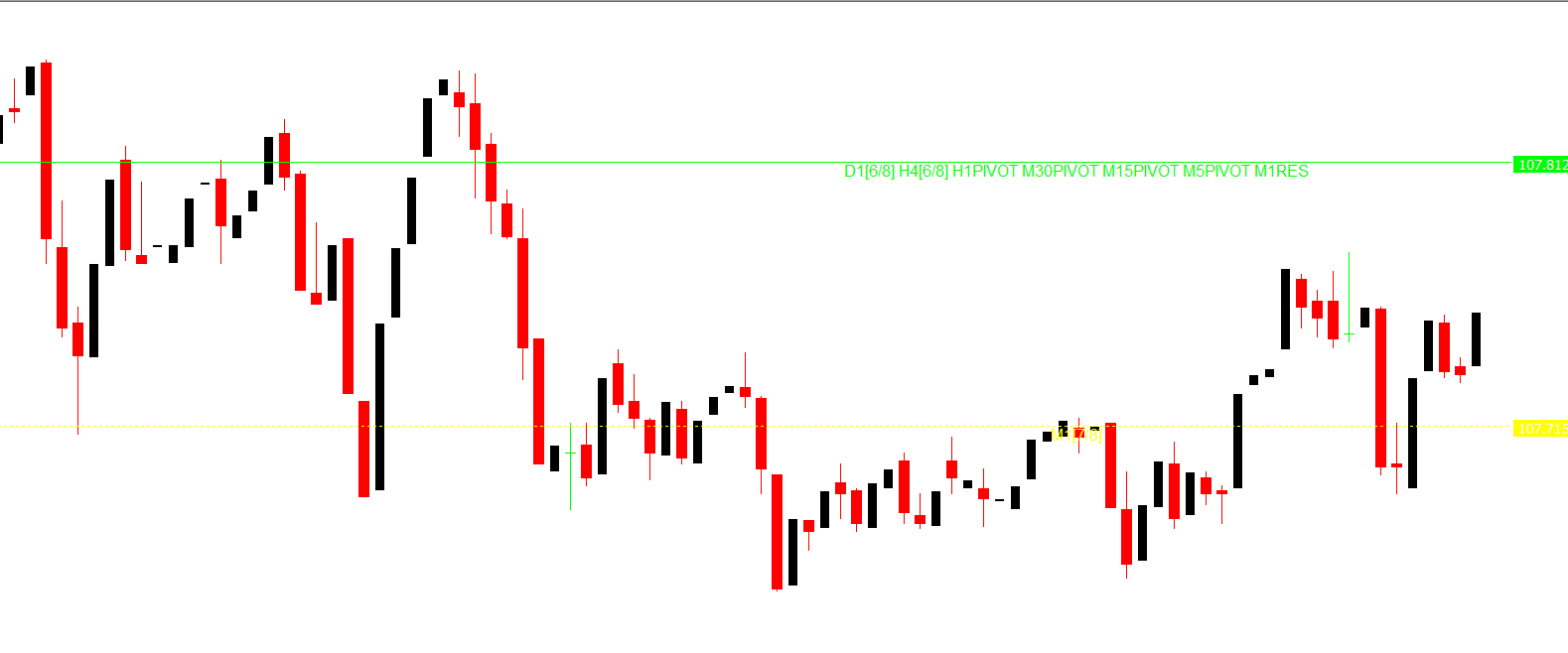 The indicator plots Murrey Math levels on the chart using different colors to represent multiple timeframes. This allows traders to quickly see how price reacts to important levels across short-term and long-term intervals.