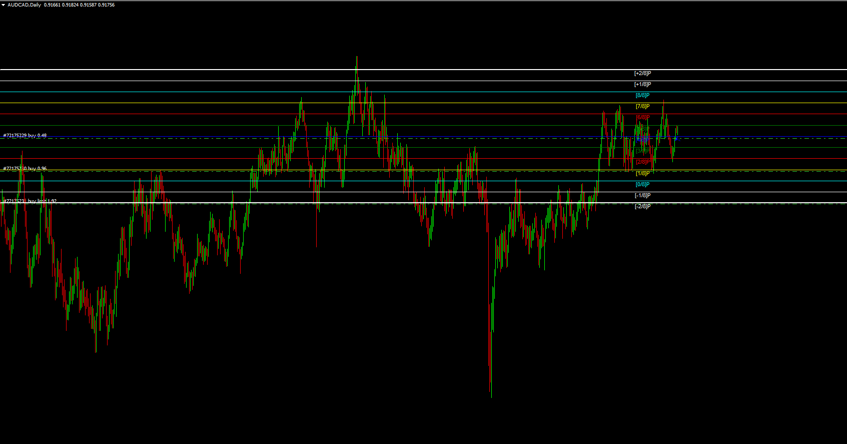 The indicator automatically plots nine Murrey Math lines on the MT4 chart: