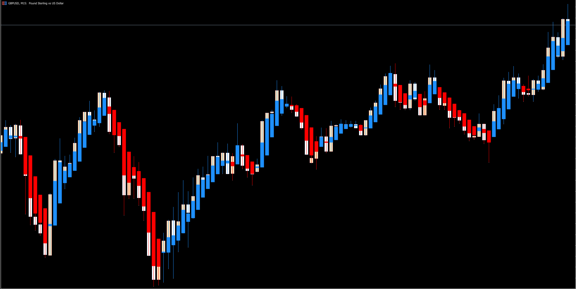 Trend Direction: Candles change color to indicate market direction — dodger blue for bullish and red for bearish